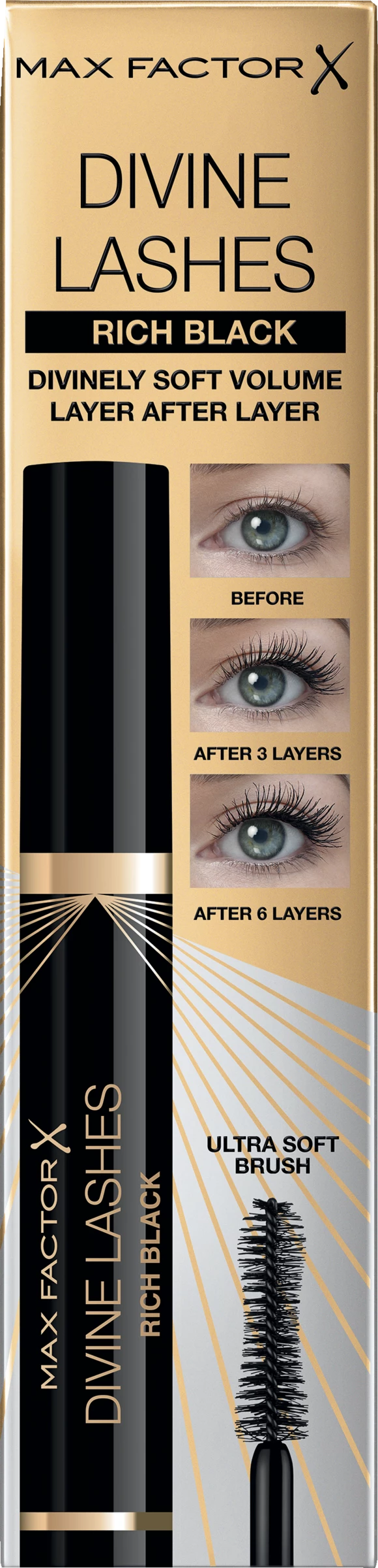 So gehtâs: Den Blick geradeaus in einen Spiegel richten. Die ultraweiche WimpernbĂŒrste der Max Factor Divine Lashes Mascara am oberen Wimpernkranz ansetzen und von der Wurzel zur Spitze fĂŒhren, bis der gewĂŒnschte Effekt sichtbar ist. AnschlieĂend nach oben schauen und die unteren Wimpern tuschen. FĂŒr ein noch intensiveres Volumen einfach wiederholen.