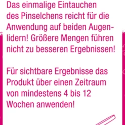 Wichtige Info: Unsere WimpernhĂ€rchen erneuern sich natĂŒrlich innerhalb eines Zeitraums von 6 bis 12 Wochen. Daher solltest Du fĂŒr optimale Ergebnisse ein bisschen Geduld mitbringen und unser Serum konsequent fĂŒr mindestens 6 bis 12 Wochen anwenden! Bitte halte Dich genau an die Anwendungshinweise. Die Devise viel hilft viel passt hier nicht. Schon eine kleine Menge einmal tĂ€glich reicht aus. Dann steht Deinen Traumwimpern nichts mehr im Weg!
